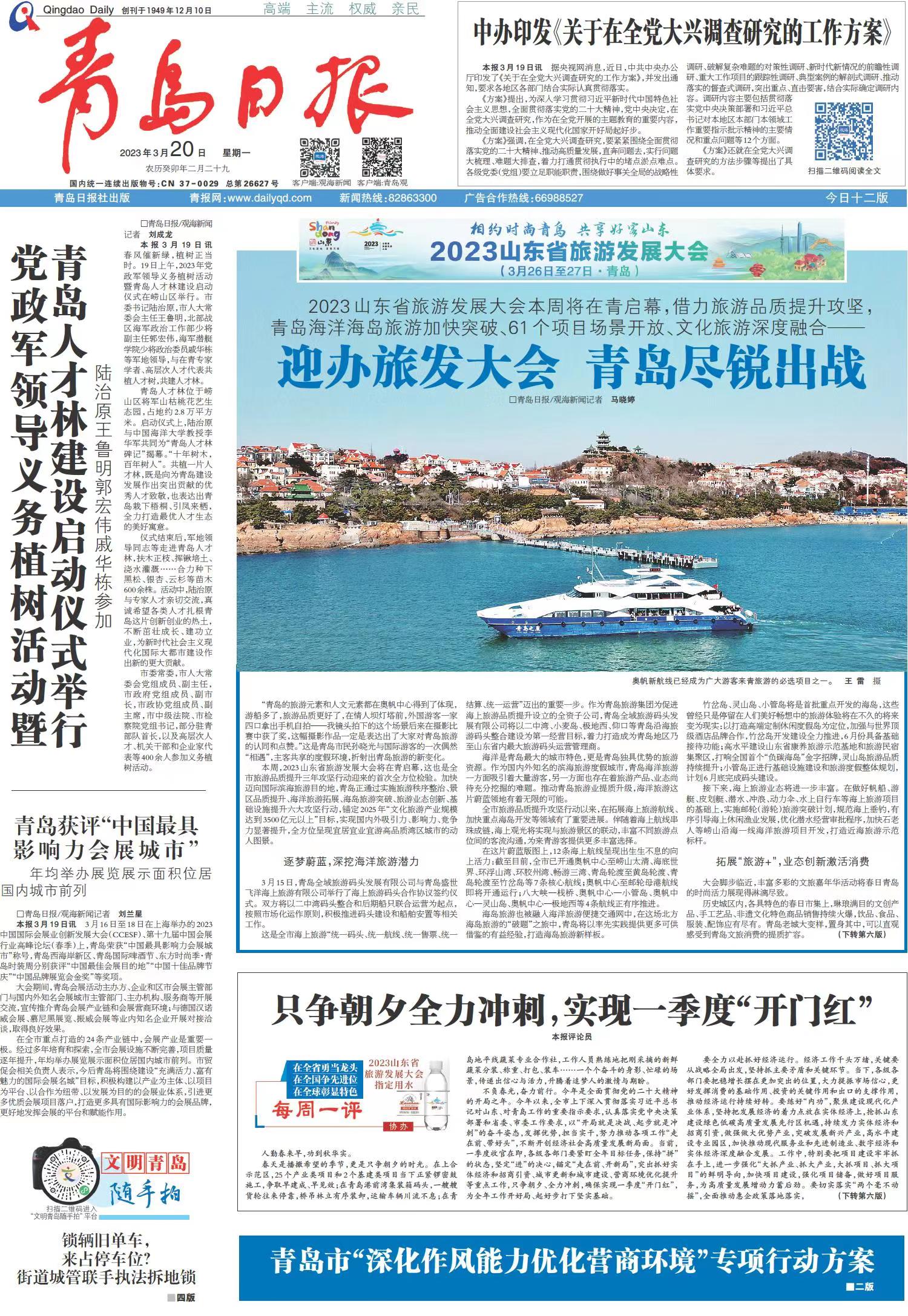 本报3月19日讯 3月16日至18日在上海举办的2023中国国际会展业创新发展大会(CCESF)、第十九届中国会展行业高峰论坛(春季)上,青岛荣获“中国最具影响力会展城市”称号,青岛西海岸新区、青岛国际啤酒节、东方时尚季·青岛时装周分别获评“中国最佳会展目的地”“中国十佳品牌节庆”“中国品牌展览会金奖”等奖项。